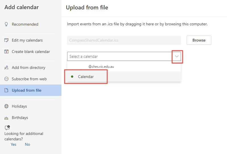 Select the calendar you want to import to. This should be the one called 'Calendar' under your CHES email address